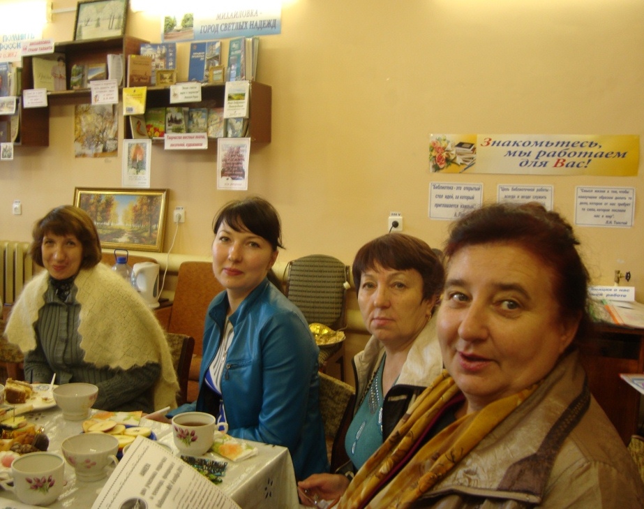 Мы очень волновались, впервые принимая у себя библиотекарей города. Постарались так оформить и украсить свою библиотеку, чтобы в ней было приятно находиться, уютно, комфортно, интересно. На 2-ом этаже появился новый большой баннер «Славные символы России», оформлены разнообразные выставки новинок: «Наш край в стихах и прозе», «Год без скучных книг»: Новые поступления в библиотеку» и др.