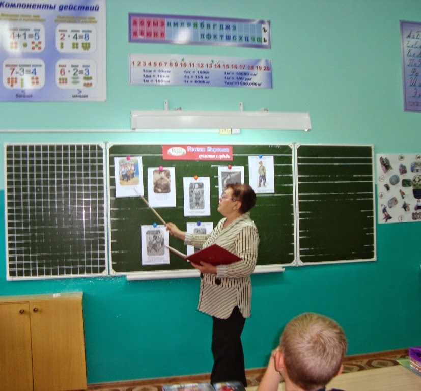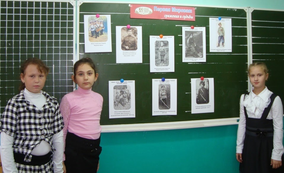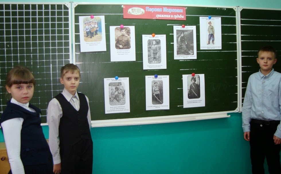3) Урок мужества «Юным защитникам Первой мировой посвящается…»: Дети – участники войны» был проведен для учащихся СОШ № 4, 4 «Д» класса (18 человек). На классной доске висели портреты юных героев войны, награжденных орденом Святого Георгия.