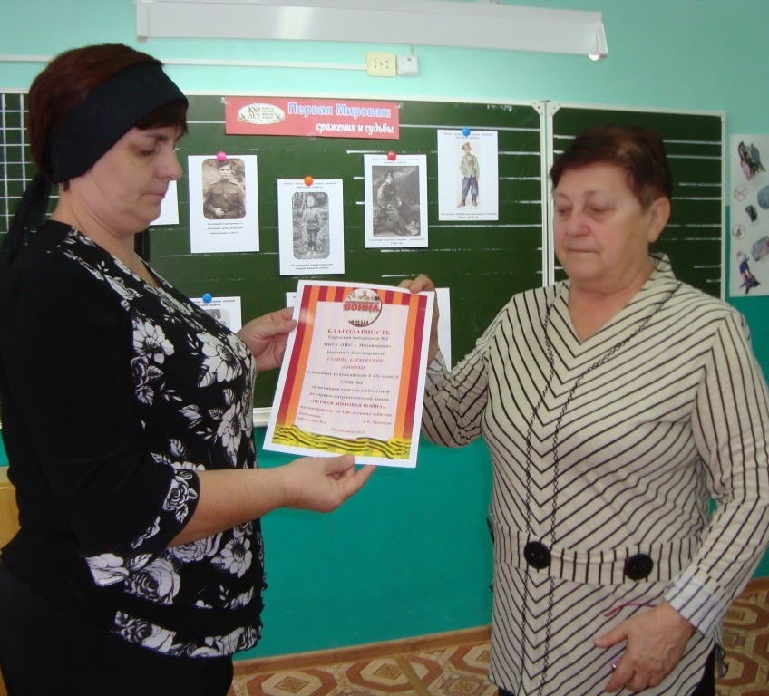 в) Исторический экскурс «Первая мировая: её причины и последствия», где кратко были изложены основные причины, особенности и результаты Первой мировой войны. Школьники посмотрели отрывки из документальных фильмов о войне, компьютерную презентацию «Хроника событий Первой мировой войны» (предоставлена Волгоградской областной библиотекой им. М. Горького - Л. А. Ульевой).